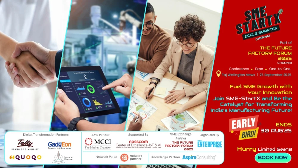 After the resounding success of SME-StartX Bengaluru, held as part of The Future Factory Forum 2025, (view Event coverage) the momentum is now headed south to the industrial heartland of Tamil Nadu — Chennai. Scheduled for 25 September 2025, this next edition promises to be bigger, bolder, and even more impactful. Powered by Small Enterprise India, and supported by NASSCOM CoE – IoT & AI and Madras Chamber of Commerce & Industry (MCCI), The Future Factory Forum – Chennai is all set to become a transformative hub where innovative startups and SME manufacturers converge to shape the future of Indian manufacturing.